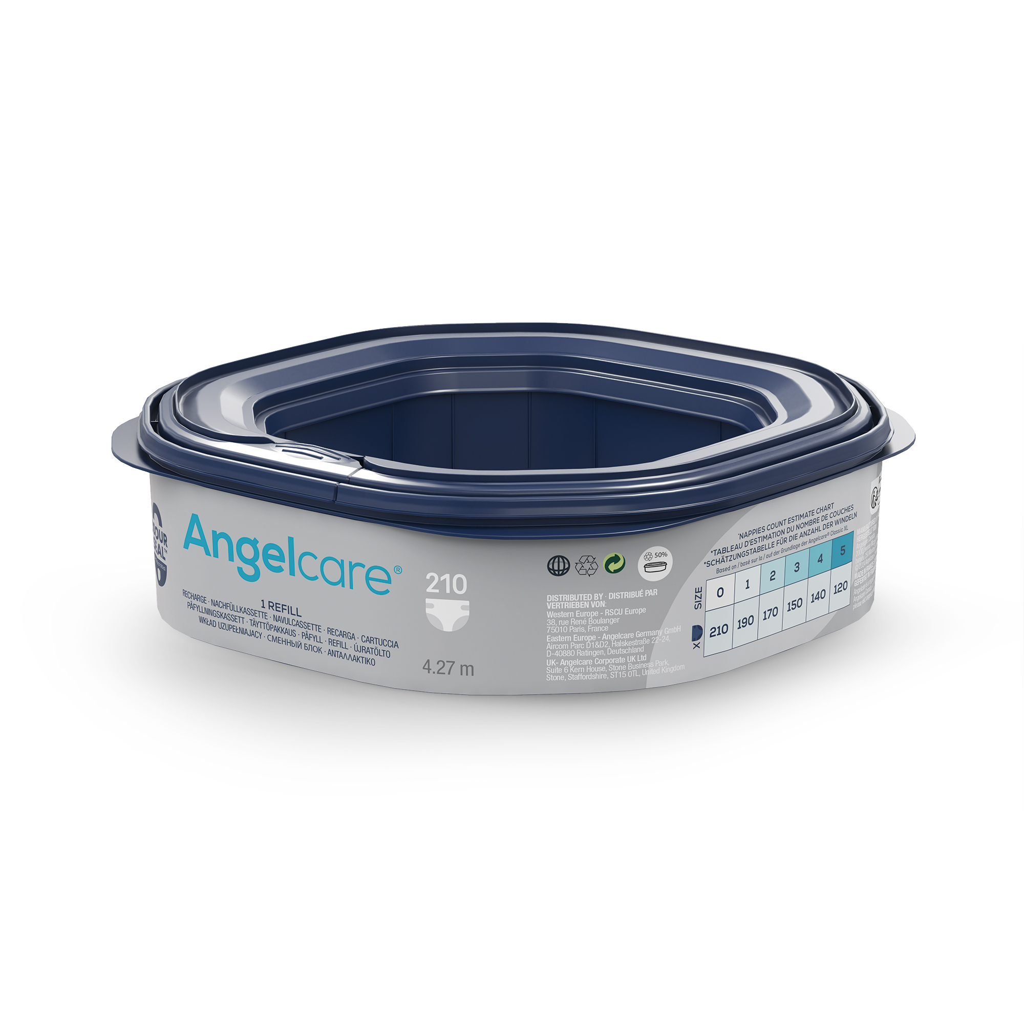 מחסניות מילוי לפח החיתולים הירוק של Angelcare מספקות דרך נוחה והיגיינית להשלכת חיתולים מלוכלכים. מכיל 210 שקיות